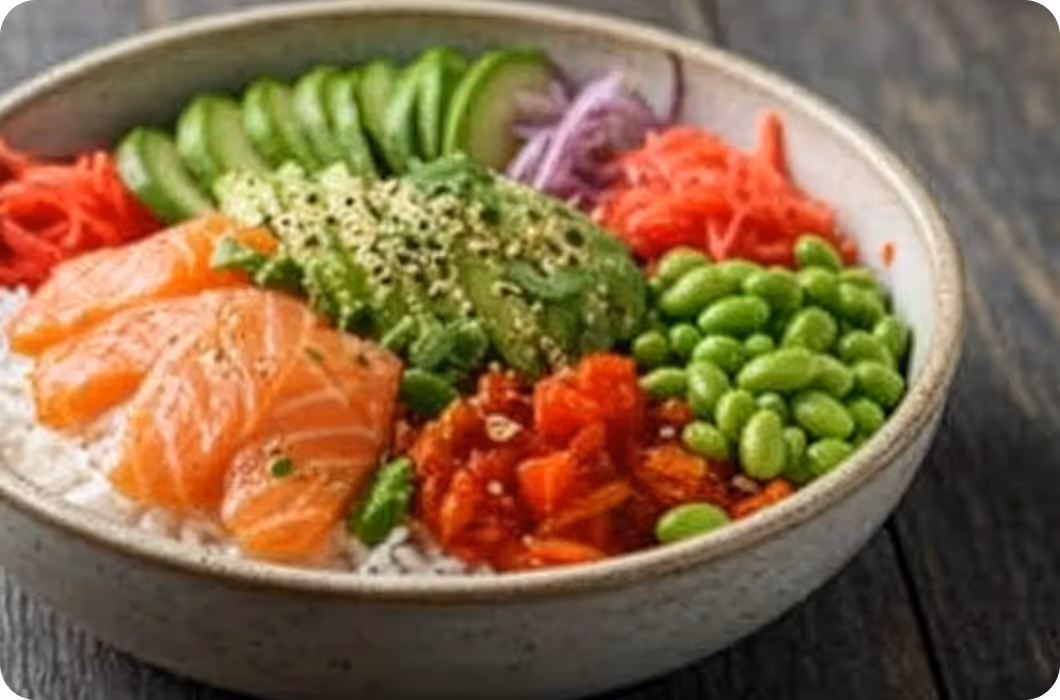3. Assemblez le bol : riz, saumon, avocat, mangue, edamame, toppings.