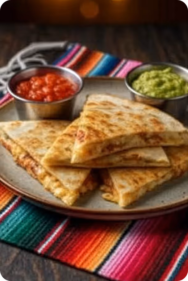 Ingrédients (4 pers) : 8 tortillas, 200 g mozzarella/cheddar râpé, épices mexicaines, poivrons émincés (option).