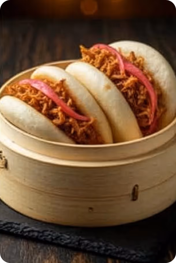 Ingrédients (4 pers) : 8 pains bao, poitrine de porc laquée, carottes/daikon marinés, coriandre, mayo + piment (option).